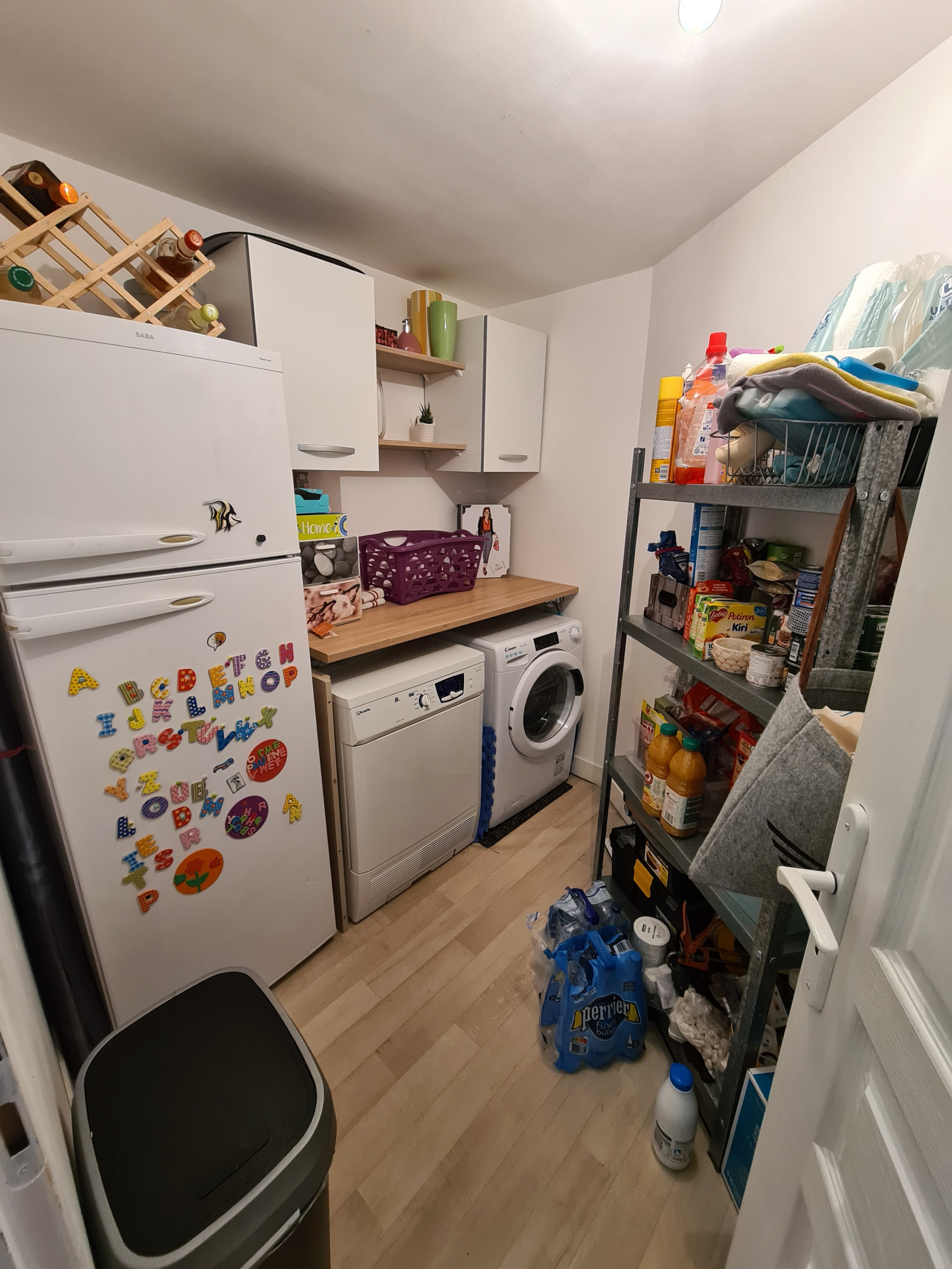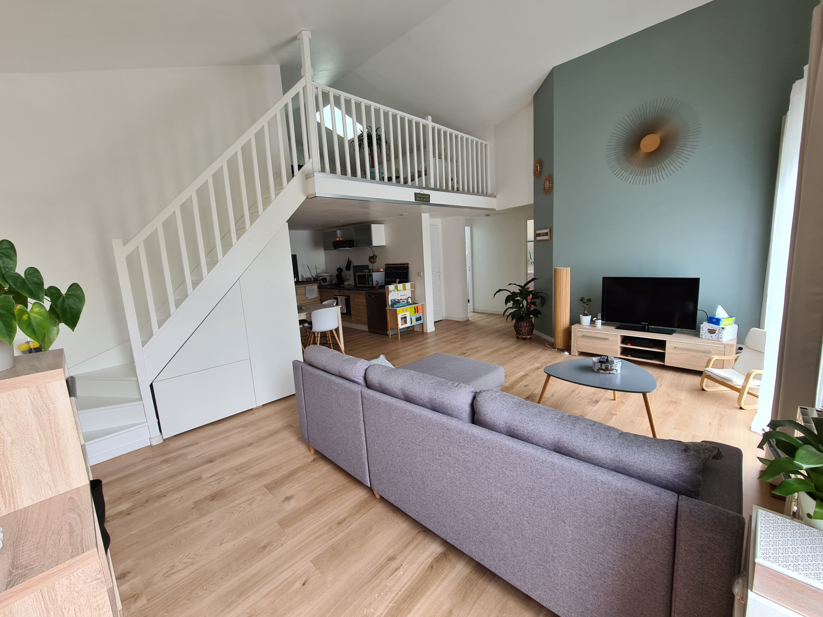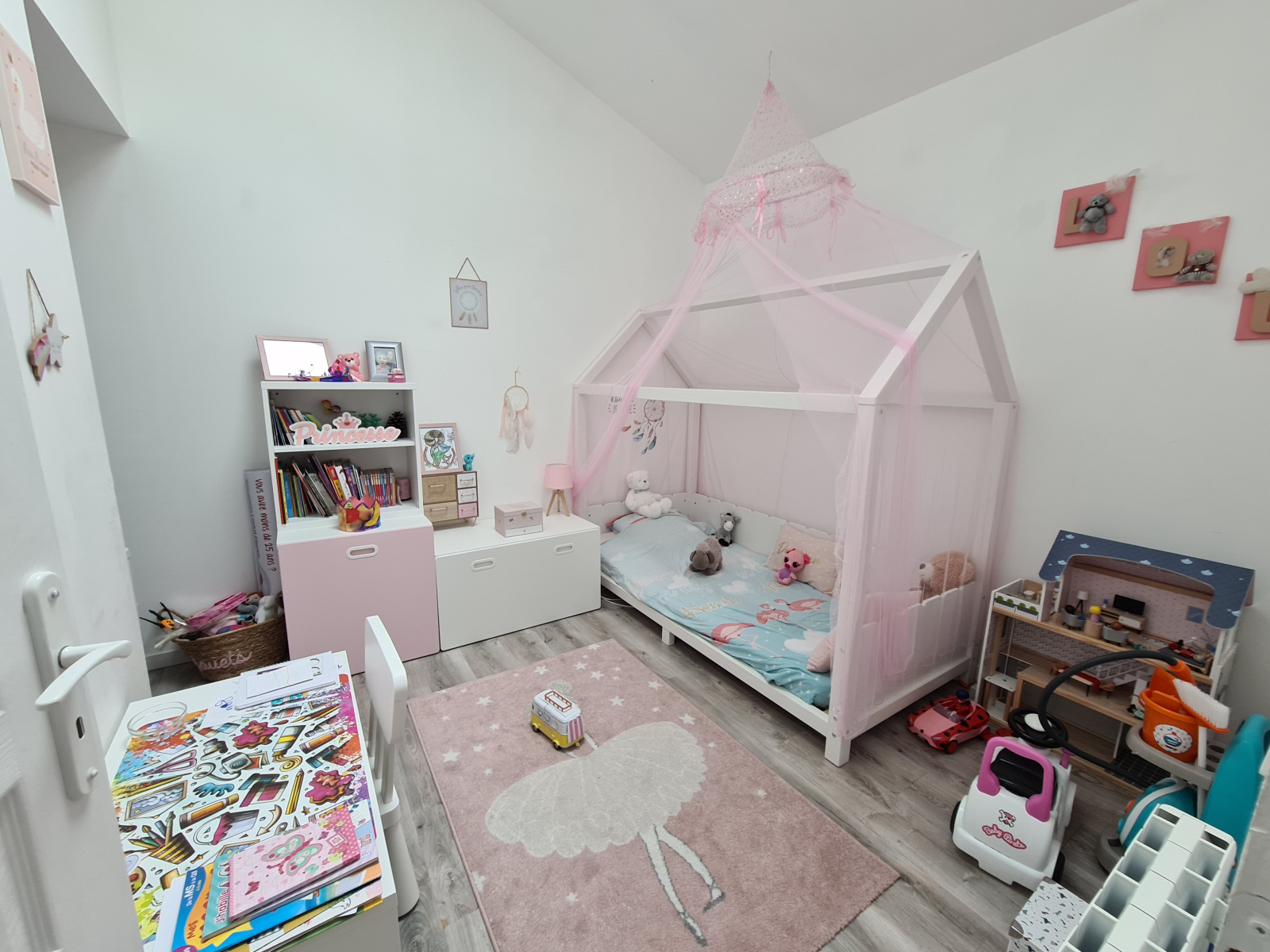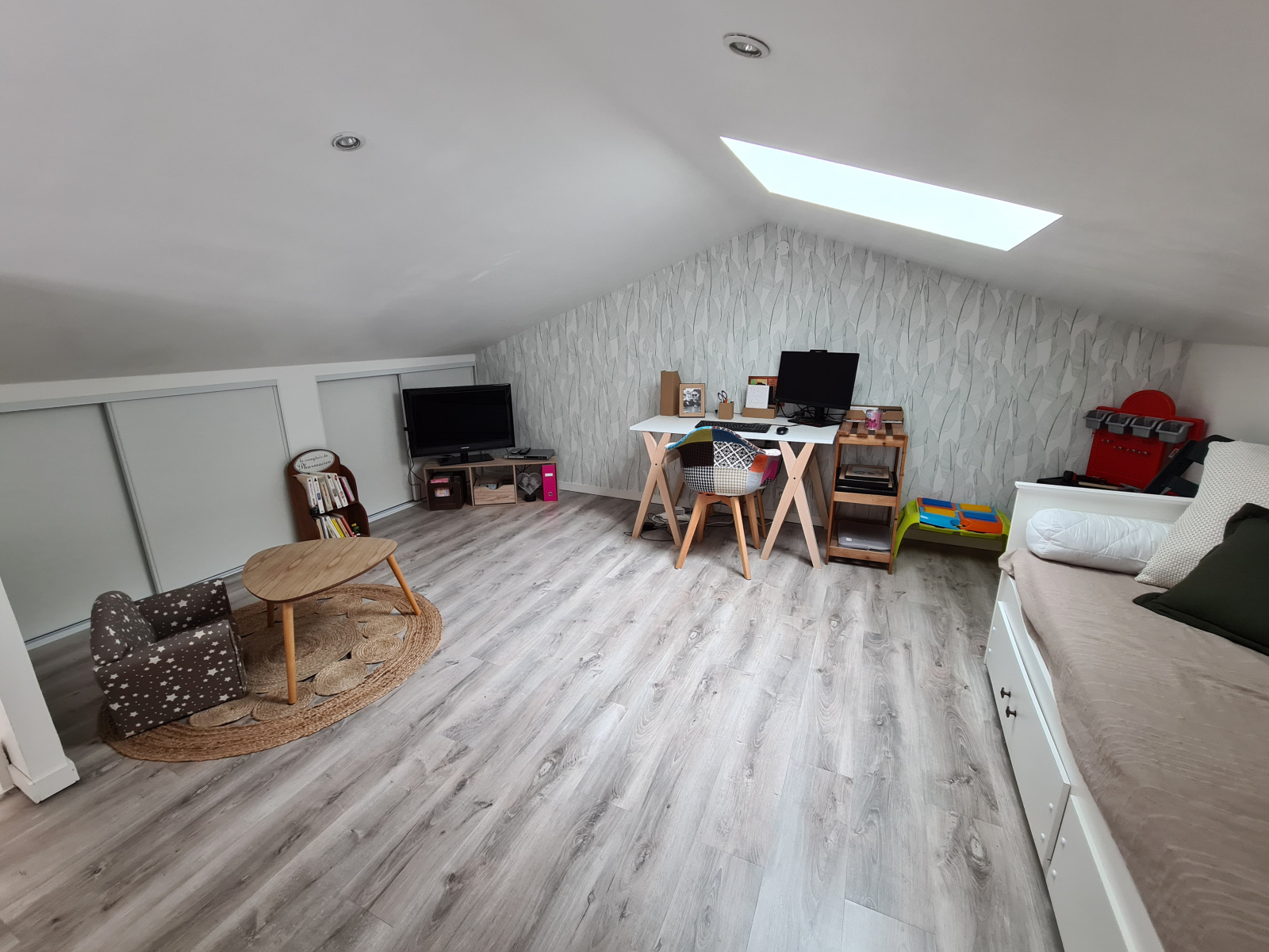 A l'étage, une grande mezzanine avec placards pouvant servir de bureau ou de salle de jeux.