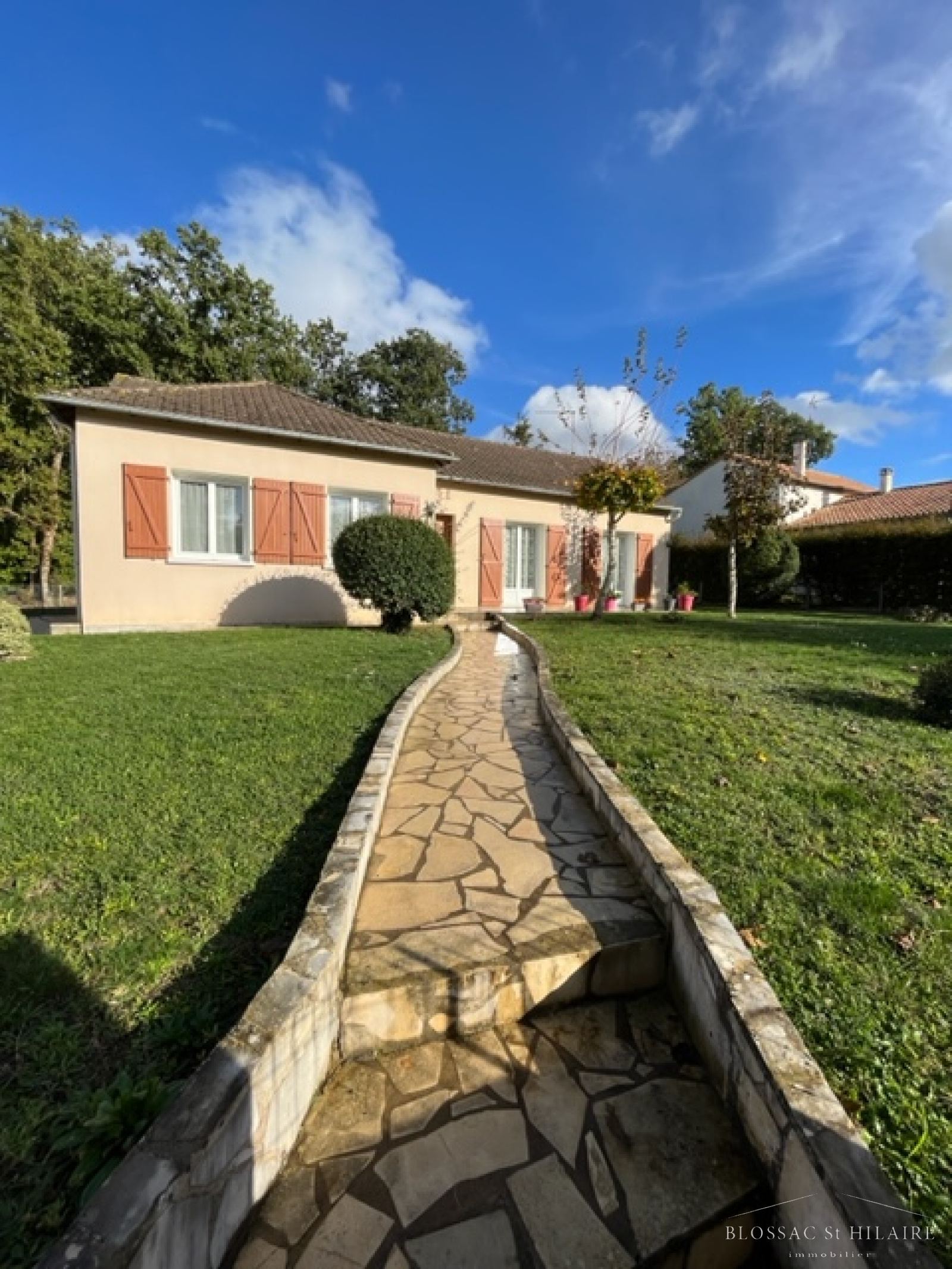 Un garage et un jardin arboré et clos.
