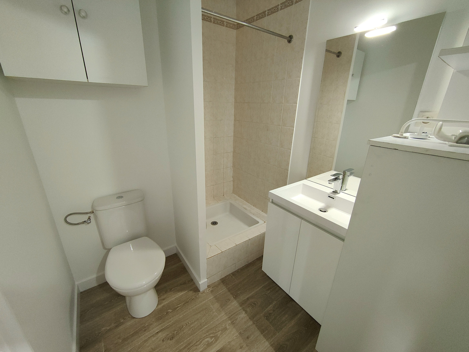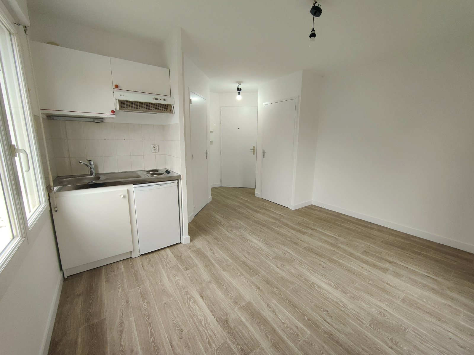 Kitchenette dans la pièce de vie, salle d'eau avec wc et placard.