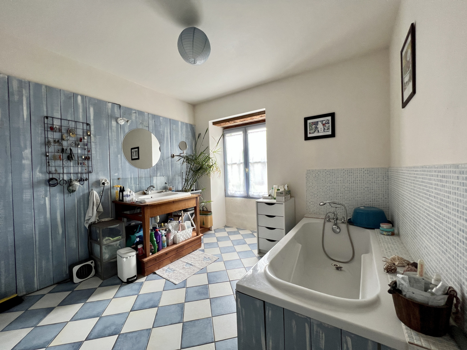 au rez-de-chaussée : une entrée avec dégagement desservant une cuisine avec cheminée donnant accès au jardin, un salon avec cheminée, une buanderie / chaufferie, un WC et une chambre. A l'étage, nous retrouvons un palier, un grenier, un dégagement avec placards, trois chambres, un WC et une salle de bains.A l'extérieur, le jardin est agrémenté d'une grange de 34 m² environ ouverte aménagée d'un côté en garage et de l'autre en terrasse. Une autre petite dépendance permet de stocker l'outillage de jardin et de bénéficier d'une autre terrasse. Enfin, un terrain de 142 m² situé à l'arrière du jardin, par lequel on accède en traversant la rue, vient compléter les prestations de ce bien et permet de réaliser un potager.