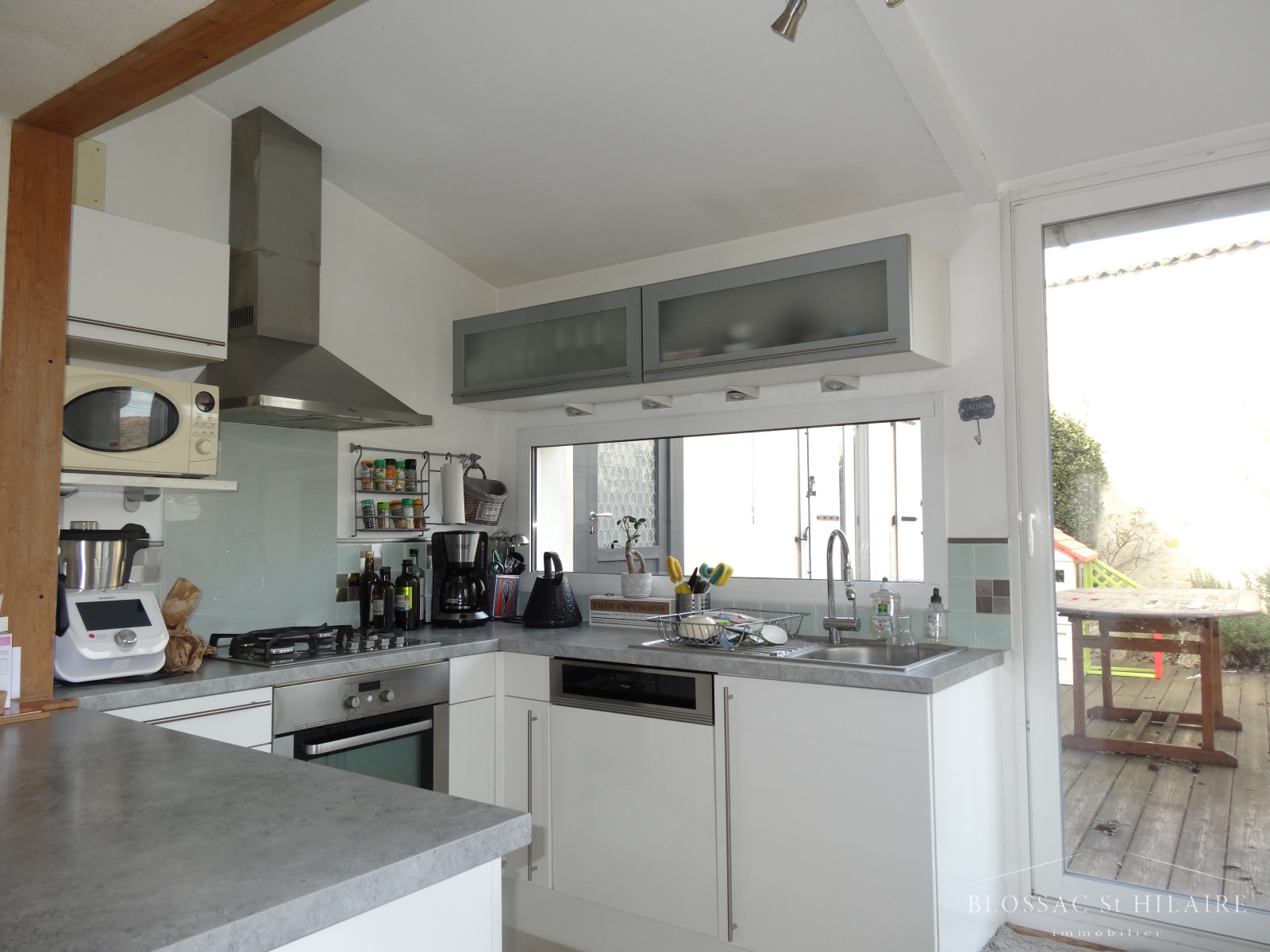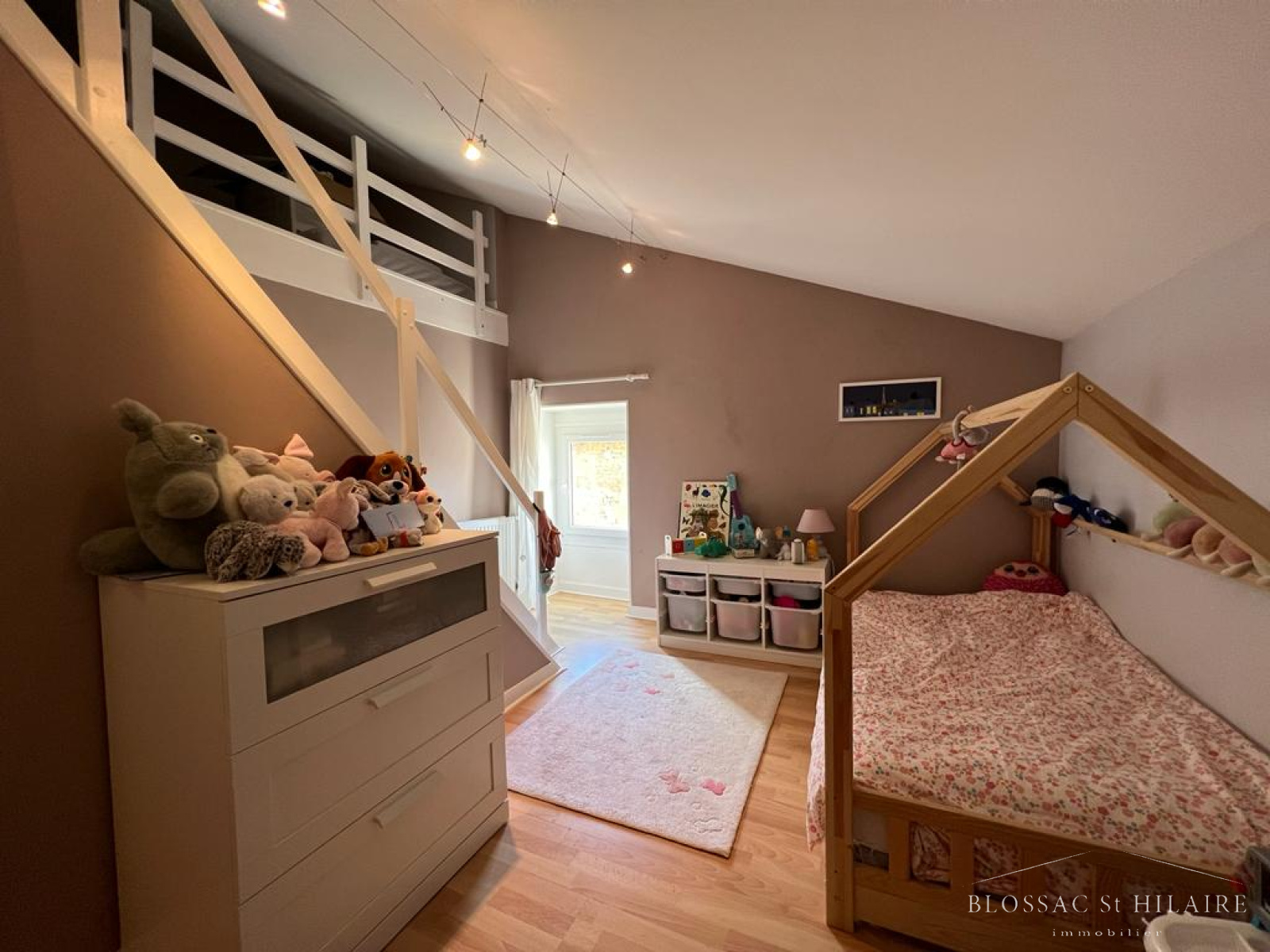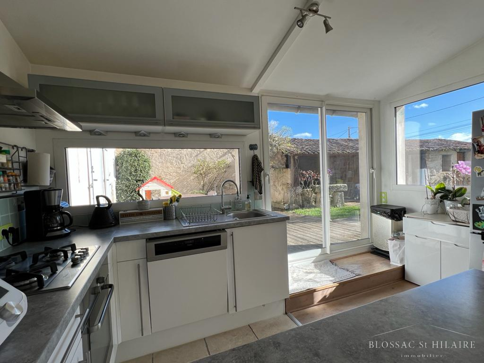 Elle est composée au rez de chaussée d'un bel espace salon/séjour avec poele à bois, d'une cuisine ouverte aménagée et équipée très lumineuse donnant sur une terrasse. Une suite parentale avec sa salle d'eau, un WC et une buanderie.