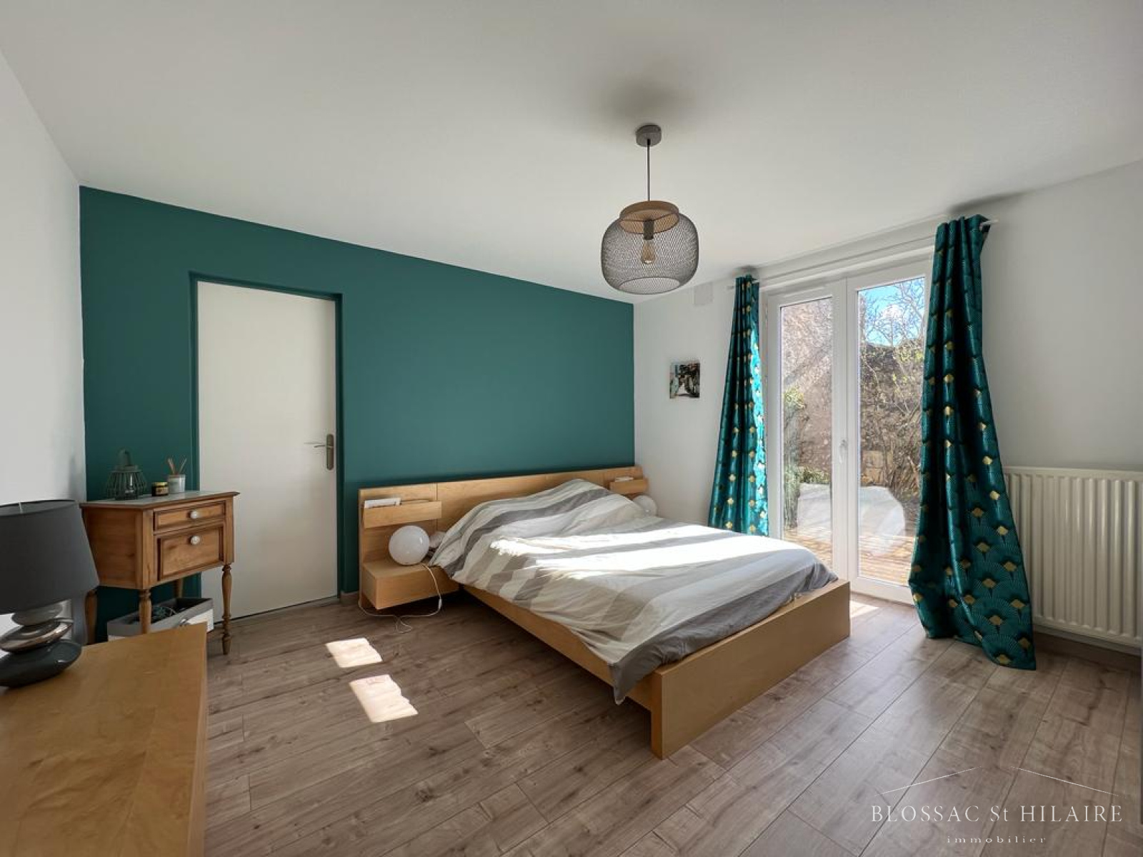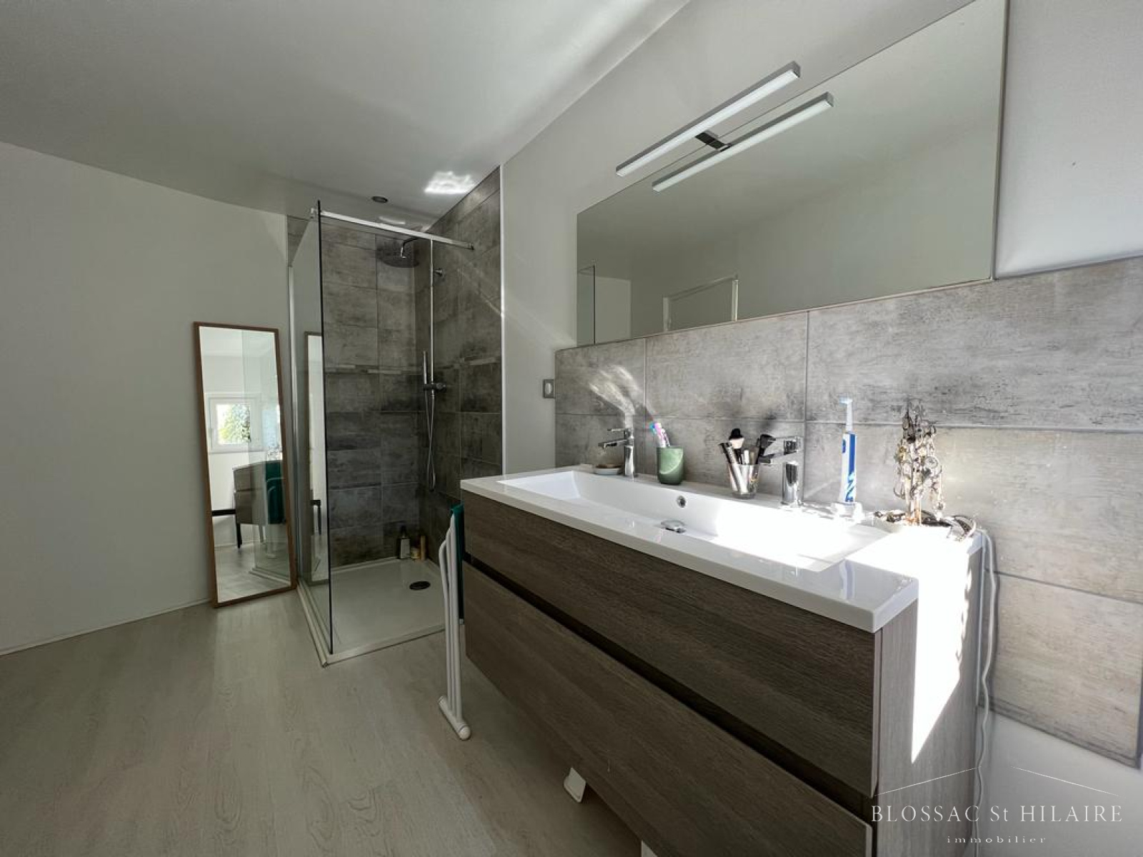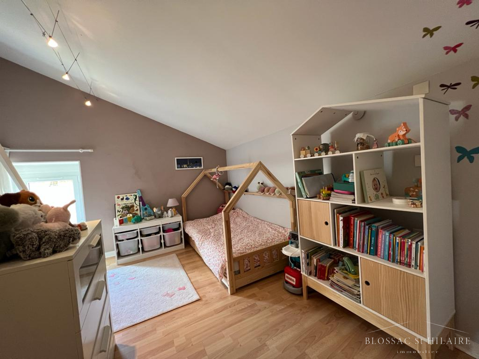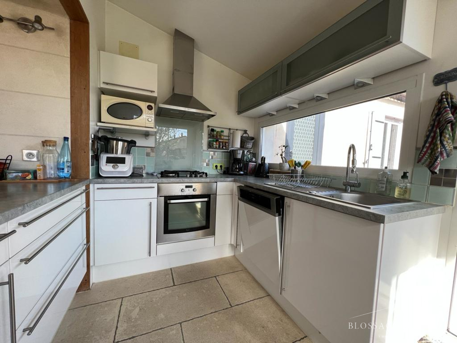 Elle est composée au rez de chaussée d'un bel espace salon/séjour avec poele à bois, d'une cuisine ouverte aménagée et équipée très lumineuse donnant sur une terrasse. Une suite parentale avec sa salle d'eau, un WC et une buanderie.
